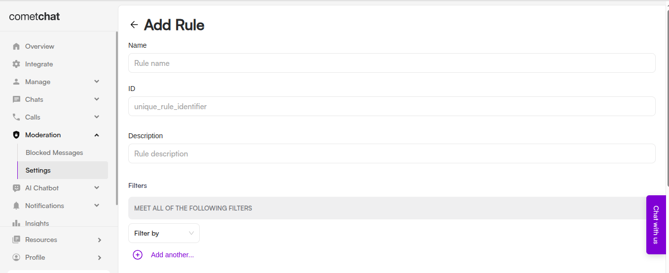 - Using the CometChat Dashboard — A simple, no-code interface for visually creating and managing moderation rules.
